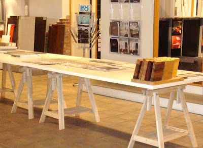 Önskemål från personalen var ett generöst bord centralt i butiken! Många plattor upplimmade på stora skivor visas -och kunderna vill gärna jämföra olika typer. Här ser ni fyra bordskivor a´200 cm långa som skarvats ihop och skruvat fast på ben bockar i trä.