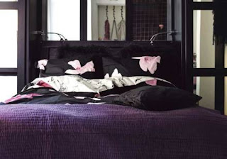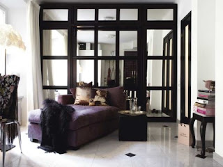 Detta är bilder från Eva Littorin lyxiga etta på 22 kvm i Stockholms innerstad. Eva är stylist och fyrbarnsmamma och detta kallar hon för; min barnfria zon. Imponerande vad många snygga instalationer det får plats på så liten yta! Färgskalan är enheltlig svart, vit och mörk lila och inredningen har oftast mer än en funktion.
