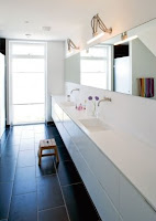 En röd ytterdörr och två röda lampor över matbordet, titta på ingången från terassen och kolla det svarta köket (…i svartbetsad ask) samma linjer från början till slut. Till och med i badrummet har de lyckats med att behålla den strama linjen som går hand i hand med arkitekturen. Sovrummet har familjen inrett smakfullt i lugna färger…ingenting kan störa sömnen här inte!