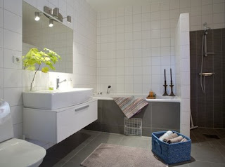 Sålänge visar jag detta badrum som påminner väldigt mycket om vårt! Jag gillar korgen med handdukar på golvet, känns så avslappnat och ombonat.