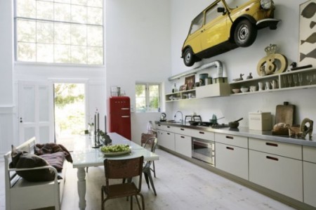 Köksbilder i magasin och på nätet har en tendens att påminna om varandra. Färger och luckor varierar och personliga ting adderas. Men denna bilden fick mig att stanna upp, en halv Fiat har hängts upp på väggen! Inte det första jag tänker på när jag ska inreda ett kök… men sååå underbart och läcket. Troligen har där legat en bilverkstad (…ser lite ut så på fönsterna) och så har familjen velat anknyta till detta i sin inredning. En 10 poängare från mig!