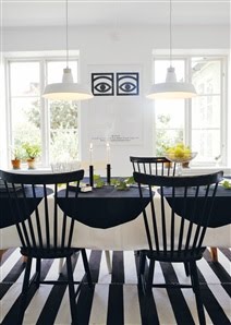 Klassiskt, grafiskt och tidlöst. Bilderna visar vita och svarta pinnstolar från Lilla Åland, Marimekko-tyg pryder bordet, Olle Eksells ögonkakao-tavla pryder väggen och svart/vita mattor pryder golven ….var vi sitter och var vi står!!!