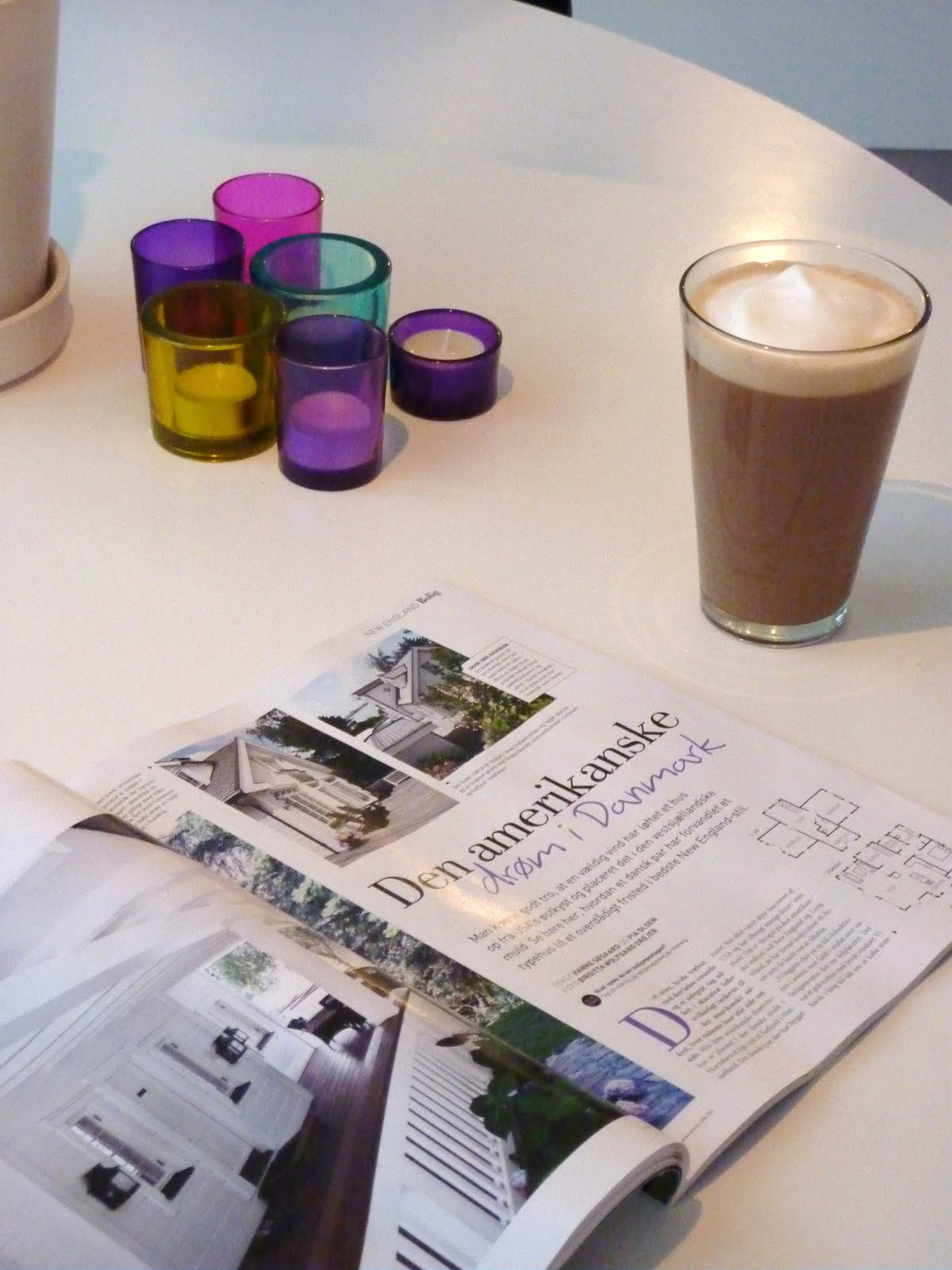 Jag visar bilder från vårt kök här i Danmark. Heltheten är långtifrån klar, men så länge bjuder jag på de här… Lampan Josephine är på plats och ger en härlig ljusspridning i taket. Blandade ljuslyktor i blandade färger (storlekar och färger) kommer från Ilva. Lägg märke till hur Latten blir mer och mer uppdrucken under fotograferingen…