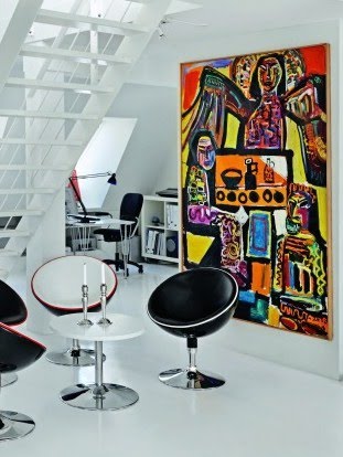 En våning i vitaste vitt –med färgsprakande konst mitt i Köpenhamn. Vilket ljusinsläpp, om än något stelt inrett. Det blir lite för uträknat på sina ställen… Favoriten blir hallen, där den ruffa spegeln bryter av allt det moderna. Ett plus för den simpla lösningen till klädhängare.