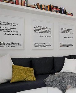 Ett annat sätt att hänga är att de är att upprepa dem. Här ser ni tre olika tavlor i samma serie, men med olika budskap. En grafisk affisch med fraser av Andy Warhole. Tidigare gick dessa att köpa på Moderna Museét, vågar dock inte lova att de fortfarande finns kvar.