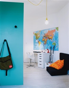 Tips; Mät rummet innan du möblerar. Välj modellen mindre på möblerna, så blir intrycket luftigare. Fråga er också; vad är det egentligen vi behöver i rummet? Säng, mjuksittning (puffar, lägre soffa) skrivbord med bra lådhurtsar och smart förvaring som sväljer alla prylar. Bäst är att bygga en hel vägg med stängd förvaring. Det kostar lite mer men är värt varenda krona för både dig och din tonåring. Här kan kläder, spel, böcker, ja allt kan få plats här! Ta bort alla småmöbler/ småförvaring, dessa ger ett rörigt intryck och rummet upplevs mindre. Låt så mycket av golvytan vara ledig. Jobba med krokar på väggen, där kan exempelvis favorit jeansen och skolväska hänga! En världskarta (se bilden) tycker jag själv är väldigt inspirerande, lärorik, och färgstark på samma gång. Och så till lampsladden, rå, cool och den finns i flera olika färger för en billig peng! Du hittar den bland annat HÄR.