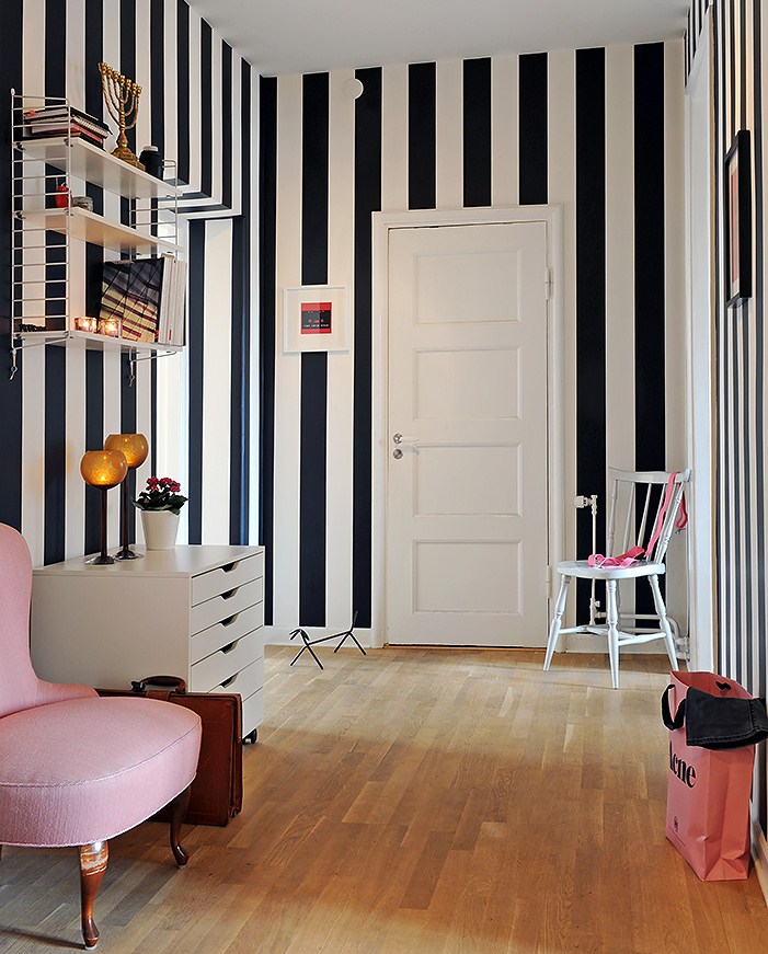 Denna vackra hall har en bra mix av maskulint (tapetern) och feminint (den underbara rosa fåtöljen) Förvarings-hurtsen Axel från ikea gör att papper och räkningar kan sorteras på en gång och nycklar och laddare kan lätt stuvas undan. Vacker bild, ellerhur?