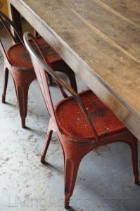 Bilderna visar ett personligt inrett kök som för mig känns väldigt höstigt och mustigt med sina roströda Tolixstolar och det gula boxskåpet. Skyltar känns som ett genomgående tema och lyser upp de vita väggarna!