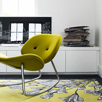 Bilden visar inte bara en snygg inredning utan också bra balans mellan accentfärgen och de övriga vita och svarta. (…gillar LP-spelaren och de slarvigt staplade skivorna. Mattan och stolen har den där gula härliga färgen som, just nu går hem hos mig. Denna HÄR möbeln står högst upp på önskelistan nu och det känns som jag vill ha gult överallt… men jag måste bromsa mig! Det blir ju lätt så plottrig annars, speciellt när det är en stark färg som gult…