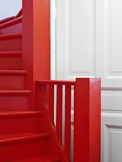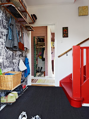 Ett av det roligaste uppdraget man kan få som inredare, är just att inreda en hall. Det gäller att skapa smarta och funktionella lösningar som fungerar i vardagen. Enligt Feng shui ska man gärna ha något rött i hallen. Färgen ”drar in” och verkar välkomnande! Här har vi en minst sagt röd detalj (…känns det nästan som man ska flyga hela vägen upp till andra våningen, haha!)