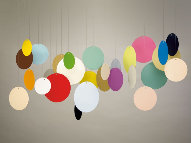 Köp färgade och/eller mönstrade ark, klipp cirklar i olika storlekar, för variation. Tryck små hål och trä igenom sytråd. Avsluta med att hänga många tillsammans i en grupp, då får du bäst effekt och en kraftfull installation.