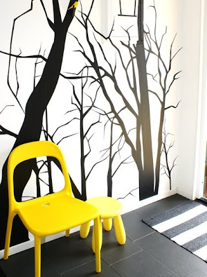 Locka in dig själv, dina nära och kära med en stark accentfärg i hallen! Här i all enkelhet. En naturlik tapet (…lägg märke till den gula fågeln) stolen Urban och en Mamutpall -båda från ikea. Den svartvita plastmattan (Rusta, tror jag) tar upp den grafiska och håller även regn/grus från blöta stövlar borta. Tapeter idag är ofta behandlade och tål en hel del. Du kan även lacka den för extra skydd. Så här, kan det se ut i hallen ibland …om man har tur! Försök jobba med en ”snygg sida” gärna den man ser när man öppnar dörren eller det man ser från intill liggande vardagsrum. Och glöm inte bort spotskenan i taket, den gör susen för hallen!
