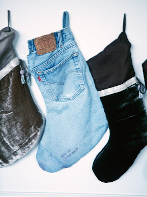 Men, om du nu är lite händig och har ett par gamla jeans över, är det bara att sätta igång och göra din; inte lika traditionella julstrumpa. En julstrumpa i jeans, cooolt! Jag önskar mitt namn inbroderat i rött. Wow, vilken personlig strumpa det skulle bli. Ellerhur känns den vuxen på något sätt och kanske är detta strumpan som DU ska lägga dina små packet eller kärlekshälsningar till din älskling! Strumporna brevid i sammet kommer från Tine K.