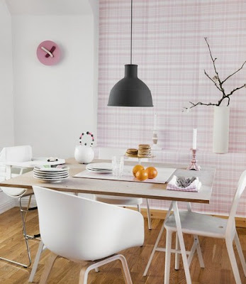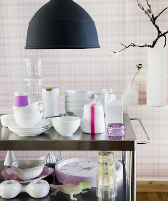 En mix av manligt och kvinnligt brukar bli bäst, varjefall när det gäller inredning. Kolla bara dessa bilder, där den rosa tapeten Rut från Sandbergs mot den svarta lampan gifter sig (…som Jannice skulle sagt!!!) Unfold finns i fem färger och är designad av Form Us With Love. Lampan är helt i silikon. I mattsvart gummi ger den ett sobert intryck till det rosa. Rullvagnen Flytta kommer från Ikea.