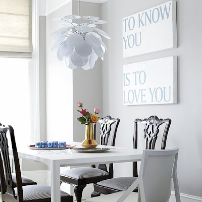 En ny vecka ligger framför fötterna och just nu är jag mitt uppe i ett konstprojekt. Kanske är det därför det haglar inlägg om tavlor, väggarangemang etc, mer om det avslöjar jag senare i veckan. Inredningssverige verkar inte få nog av fina ordcitat på väggarna. Här kommer ännu ett från internationella inredningstidningen Living Etc. Visst är det en del av en sångtext? ”To know you, is to love you…” kan inte komma på vilken bara? Hur som helst är det fina ord att mötas av i köket. En ljus och behaglig matplats där de gamla stolarna bryter av fint mot det vita. Snygg kontrast blir det med den moderna lampan Discoco.