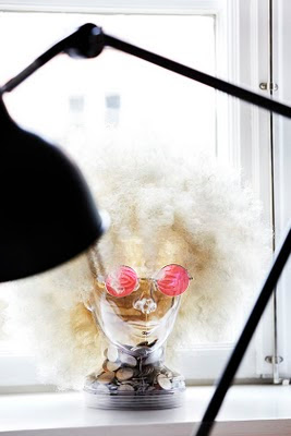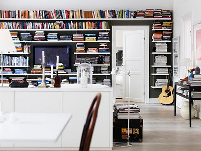Första bilden ovan (…sparbössa med peruk och solisar) är bara störtskön. Personliga detaljer i hemmet är alltid rätt. Vem skulle inte bli glad av att mötas av den? Bilden nedan visar hur man lagt allt krut på en vägg. Gråfärg, bokhyllor som fyllts med böcker till bredden. Ett plus är faktiskt att TV:n försvinner in bland alla dessa bokryggar mot den grå väggen.