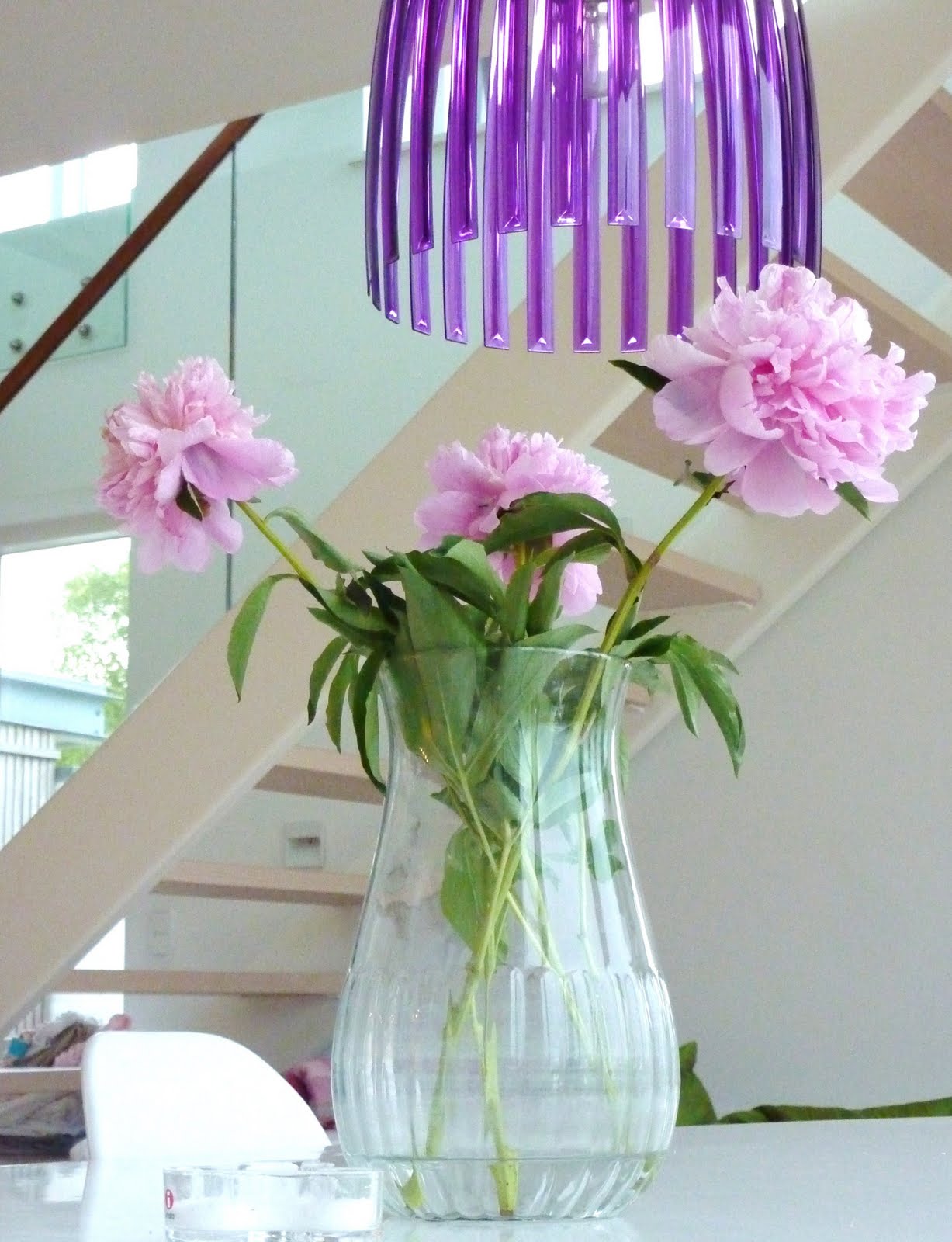Köksbordet pryds denna vecka av tre enkla snitt av favoritblomman Pion. Så vacker i full blom. Vanligtvis köper jag inte gärna ljusrosa blommor av någon anledning men oj, ibland blir man överraskad. Ellerhur är de fina till vår lampa i stark lila? Mer ljusrosa lär det bli framöver… // Kram Sofie
