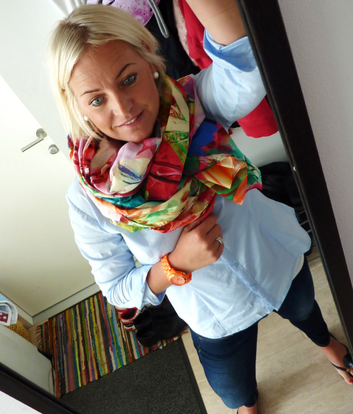 Klockan Orange Revolution, kommer från Triwa. Jag kan varmt rekomendera dessa klockor. De är superlätta och finns i massor med härliga färger, jag har denna sen innan. Multi färgad sjal köpte jag på Vero Moda. Jeans Benetton LUND och stjorta HM.