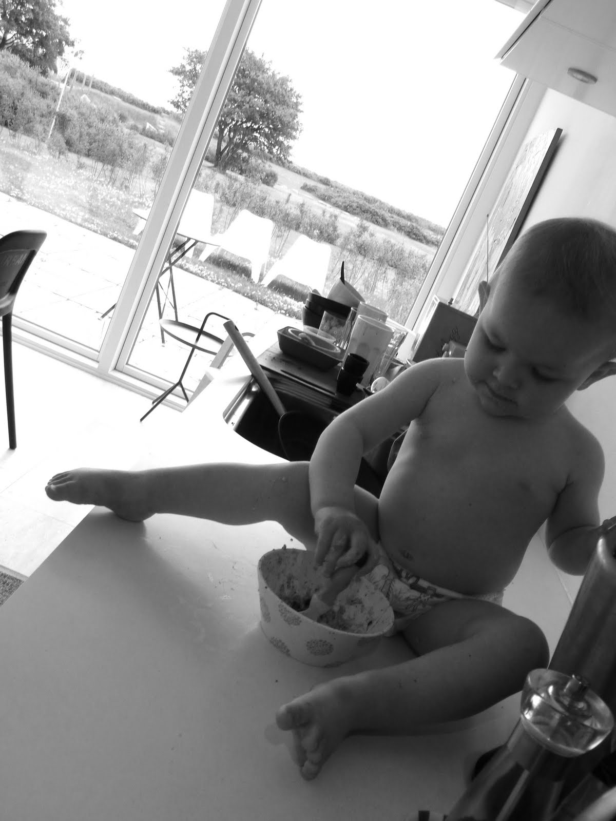 Nu sover hon som en stock, efter att ha nattsuddat och mamma ska iväg och köra ett morgonpass på gymmet. Sen blir det mys för hela slanten och kanske mamma låter henne få sitta på köksbänken och äta själv som här. En liten skål med fil och musli tog en timme sist, men oj vad hon gillade det.