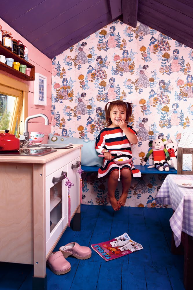 Tapeten binder ihop den härliga färgmixen av; rosa träpanelen, blå golvet och det lila taket. En maxad lekstuga där avskalad minimalism lyser med sin frånvaro….