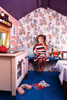 …ska jag och Ebba pimpa hennes lekstuga, det har jag lovat. Hon har saknat sitt ”egna” lilla kryp-in i trädgården, och gissa om hon fick blodad tand när hon såg dessa bilder i mammas Family Living .
