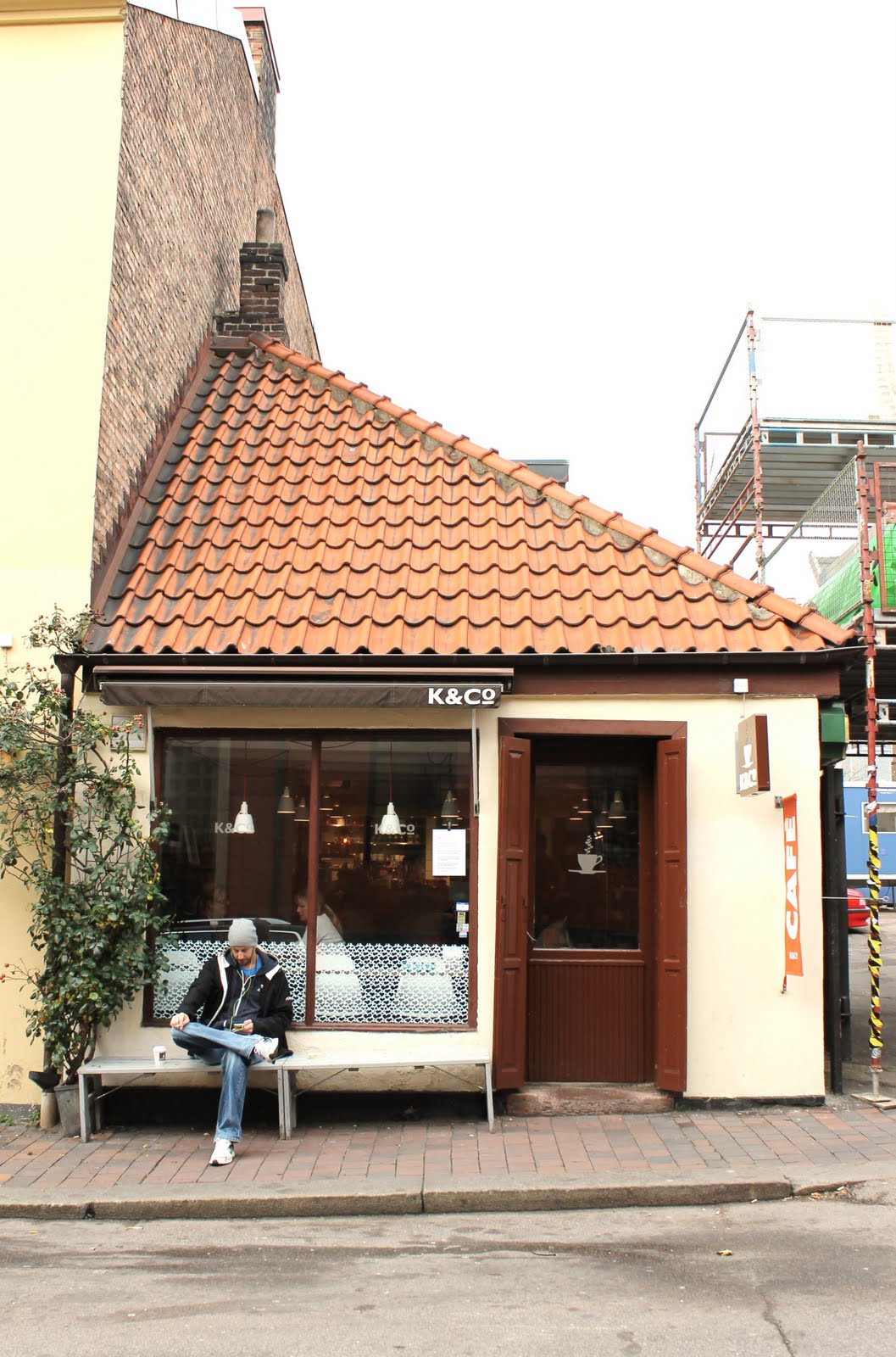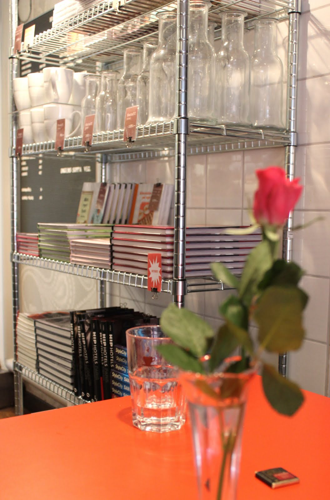 På just detta fik hamnade jag efter en mysig promenad i Helsingborg för lite sedan. Ett av mina drömprojektet att inreda just ett café, och här på K & Co blommade drömmen upp igen. Jag blev verkligen inspirerad hur de jobbat med färg och form, olika stilar, och koncept. Extra kul är det när det finns ett handplockat urval av såväl litteratur, CD-skivor, choklad, te, som glasflasker och muggar. Blev även sugen på att tillverka egna bord i mdf…DIY är det ju som gäller! Ellerhur är de fina? Det borde väl inte vara så svårt? Också sådär snyggt lackade i min favoritfärg just nu, neonorange. Gillar verkligen att de behållt kanten träfärgad! En annan detalj som de får till i inredningen, är hur de knyter ihop underredet på DSR stolen med de industriella hyllorna i metall, vet att det är Ikea PS, men jag kommer inte ihåg namnet. Någon annan som vet kanske? Nåväl, mysigt som tusan var det där och jag kommer betämt att återvända igen. Ha en bra tisdag därute! Kram //Sofie
