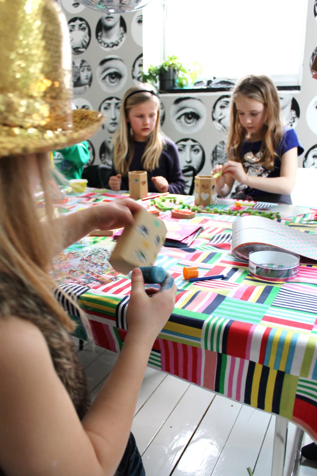 Lite scraping fick det ju också bli på Ebbas kalas. Enkla pennmuggar köpte jag på Panduro och fina blev muggarna med diverse scraping material. Papper, glitterlim, sticker, band etc. Kreativiteten flödade och det var SÅ kul att se hur barnen bara pysslade på, helt inne i sina egna små världar. Tulpanerna fick tillfälligt flyttas och stod faktiskt riktigt fint framför Manhattantavlan.